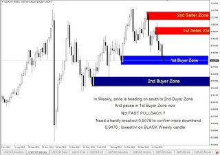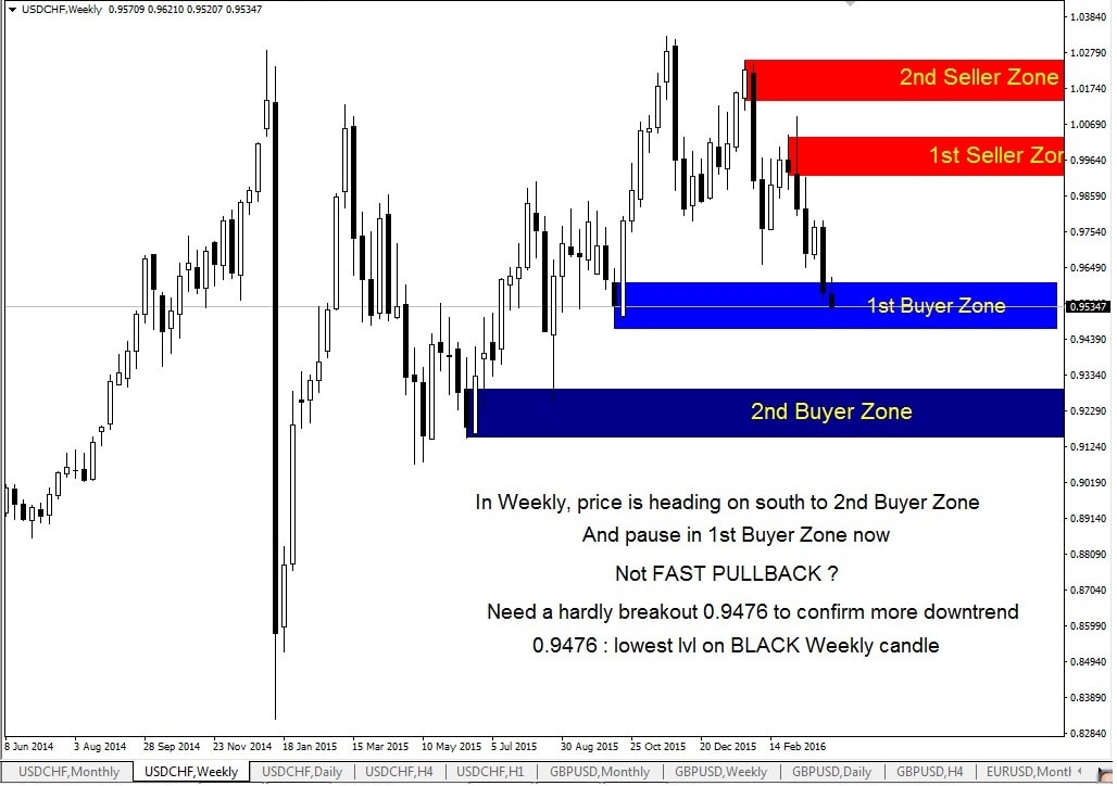 USDCHF - Forex Signal Strategy will be analyzed from Last week, there is no major event from Swiss and USDCHF is still in 1st buyer zone on Weekly. On Monthly USDCHF is heading to 1st buyer zone, while Daily : price downtrend was being held by 1st buyer zone. USDCHF on 4H had broken hardly buyer zone : seller domination.
